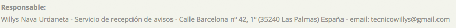 Queda prohíbido reproducir, transmitir o copiar el contenido total o parte de esta web, a menos que sea explícitamente autorizado por escrito. tecnicodeneveraslaspalmas.com autoriza a cualquier persona física o jurídica el establecimiento en sus páginas o sitios web de enlaces a éste, tanto a la página inicial como a cualquier otra de las páginas del sitio; excepto en el caso de que las páginas o sitios donde vaya a figurar el enlace tengan contenidos de carácter pornográfico, violento, xenófobo o ilegal de cualquier forma. Las nombres ajenos a este sitio, utilizados en él, pertenecen a sus propietarios legales y se mencionan simplemente como información. Por la navegación por cualquiera de las páginas web asociadas a este dominio y/o por la utilización de dichos servicios incluidos en las mismas, Vd. adquiere la condición de Usuario. Tanto la navegación como la utilización de cualquiera de los servicios ofrecidos suponen la aceptación como Usuario, sin reservas de ninguna clase, de todas y cada una de las presentes Condiciones Generales de Utilización de la Página Web. Para la utilización de nuestro sitio web es necesario la utilización de cookies. Ampliar la información en Politica de Cookies